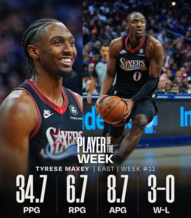 上周,马克西率领76人获得3连胜,场均入账34.7分、6.7篮板、8.7次助攻,投篮命中率高达61.2%。