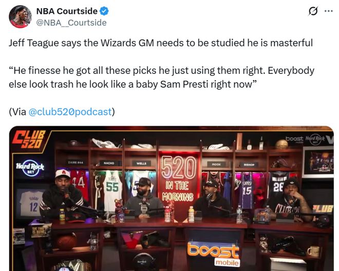 蒂格就在节目中公开称赞了奇才总裁迈克尔-温格:“他是一名大师,操作手法精湛,让其他人黯淡无光,在握有如此多筹码的情况下,巧妙的利用了手中的选秀权,看起来就像是年轻版本的普雷斯蒂(雷霆总经理)。”