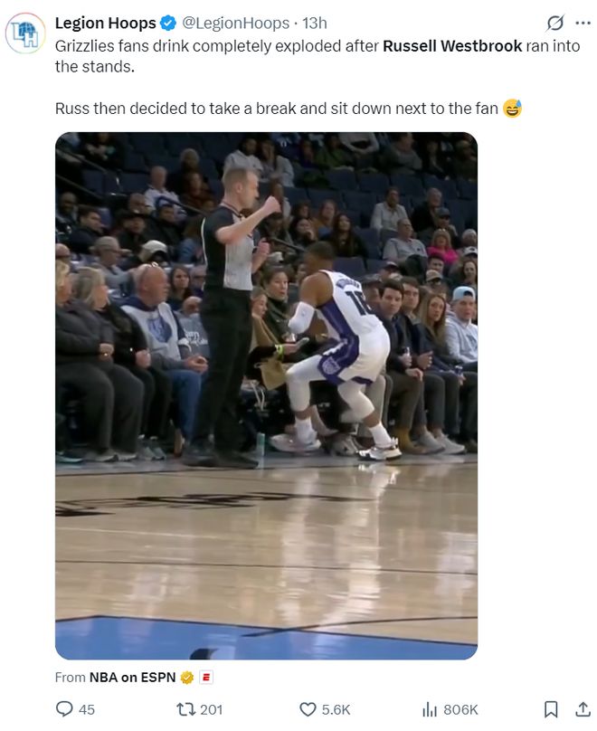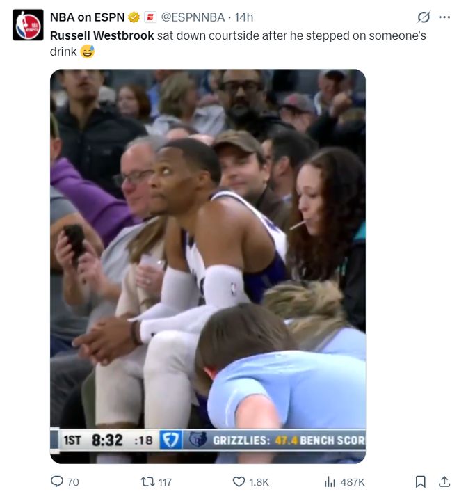 此役威少还有一个救球成为全美热议的话题,威少直接冲到了第一排的观众席,威少直接打翻了一杯饮料。