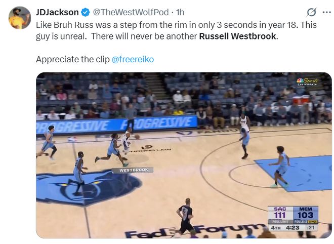 这场比赛美记JD-杰克逊盛赞威少,威少在职业生涯第18年还可以持球推进只花3秒就到对方篮筐附近,这家伙太厉害了。再也不会出现像威少这样的球员了。