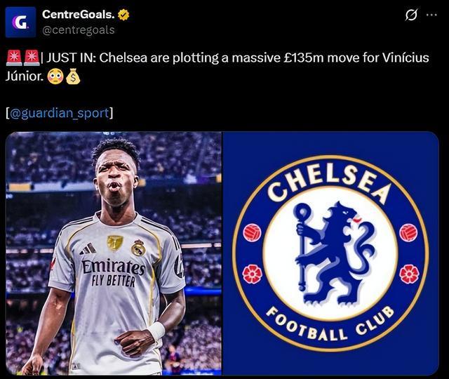 马雷斯卡下课后,切尔西立刻在伊蒂哈德球场1-1逼平曼城,恩佐·费尔南德斯第95分钟打入绝平进球。周一,多家媒体称蓝军正考虑一笔可能打破英国转会纪录的交易。今年夏窗,利物浦先后以1.16亿英镑签下维尔茨、1.25亿英镑引进伊萨克,两度刷新英国的转会费纪录。如今,《卫报》透露,切尔西正“策划”以1.35亿英镑求购皇马边锋维尼修斯。