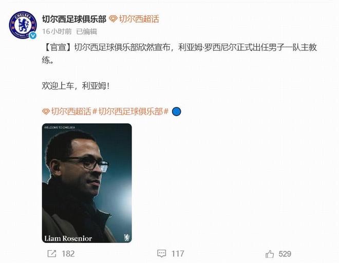 北京时间1月6日,切尔西官宣新帅罗塞尼尔(Liam Rosenior)上任。