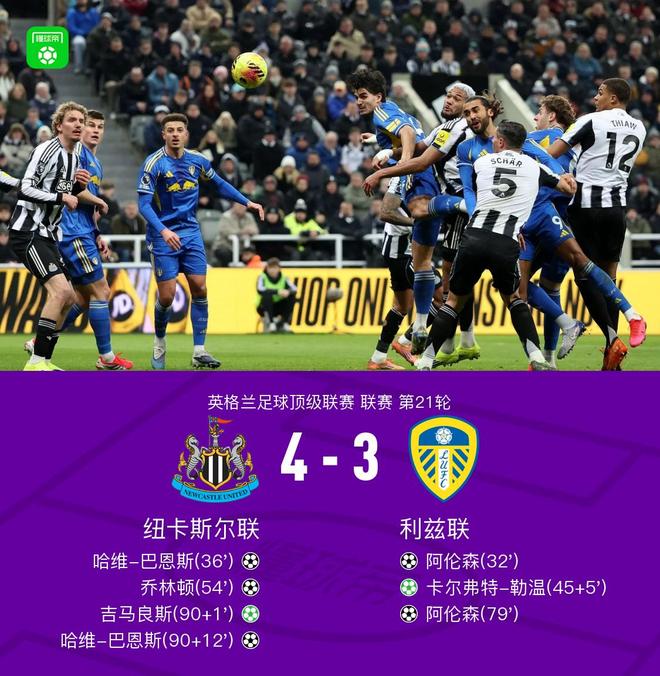 纽卡4-3利兹联,巴恩斯读秒绝杀+双响,阿伦森双响+送点,勒温、吉马良斯传射-24直播网