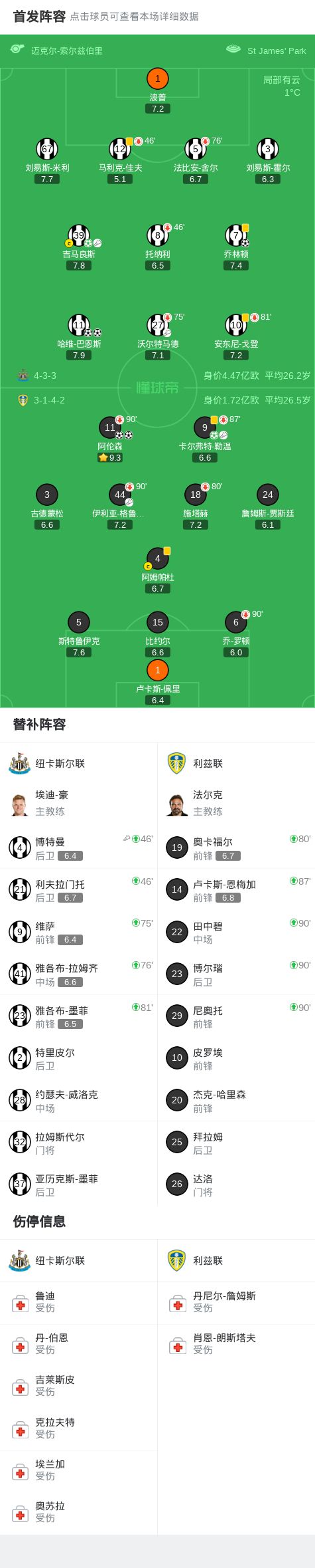 第32分钟,佳夫出球失误,勒温助攻阿伦森破门打破僵局,利兹联1-0纽卡