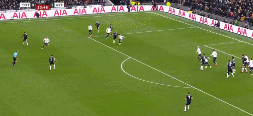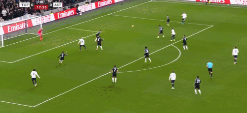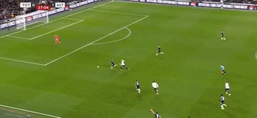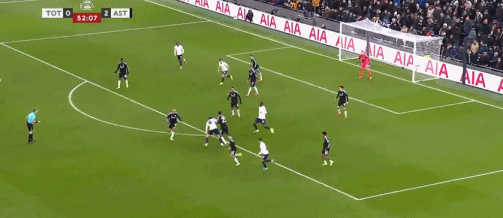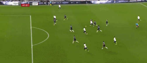第45+3分钟,布恩迪亚脚后跟做球,罗杰斯破门,维拉2-0热刺